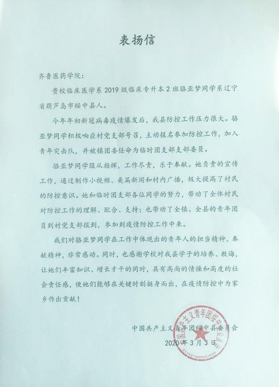 近日,齊魯醫(yī)藥學(xué)院臨床醫(yī)學(xué)院2019級臨床專升本2班駱亞夢同學(xué)(遼寧省葫蘆島市綏中縣人),因在疫情防控工作中表現(xiàn)出色,受到了共青團(tuán)綏中縣委員會致信表揚(yáng)。