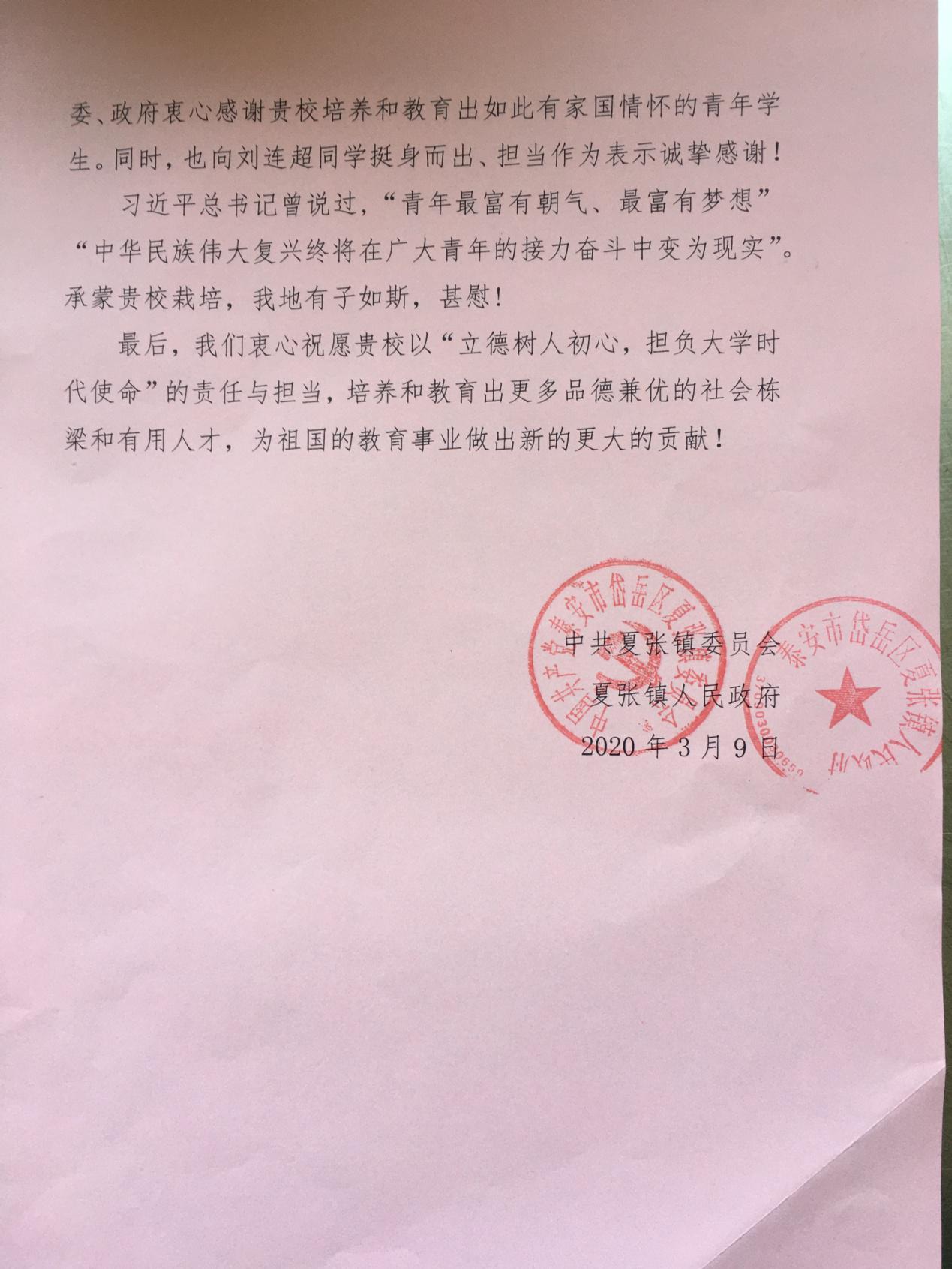 近日,山東商院收到了一封來自泰安市岱岳區夏張鎮的感謝信,信中對學院劉連超同學在當地疫情防控工作中的付出與貢獻表示感謝。