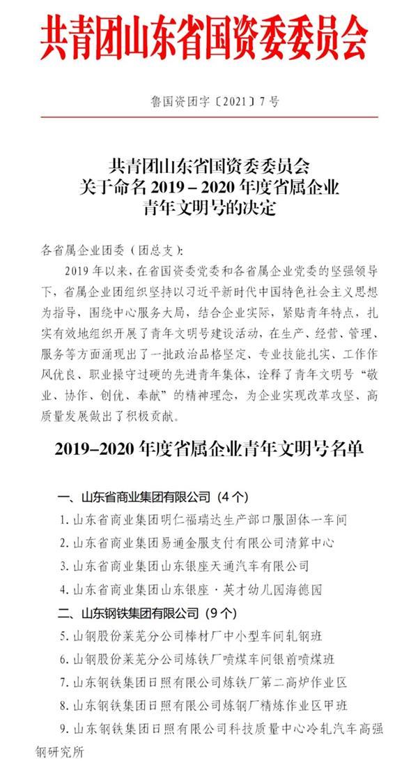 近日,共青團(tuán)省國資委委員會(huì)公布了《關(guān)于命名2019-2020年省屬企業(yè)青年文明號(hào)的決定》,集團(tuán)所屬的明仁福瑞達(dá)生產(chǎn)部口服固體一車間、易通金服支付有限公司清算中心、山東銀座天通汽車有限公司、山東銀座·英才幼兒園海德園榮獲“省屬企業(yè)青年文明號(hào)”榮譽(yù)稱號(hào);銀座商城股份有限公司玉函分公司等9家單位均通過“省屬企業(yè)青年文明號(hào)”復(fù)查。