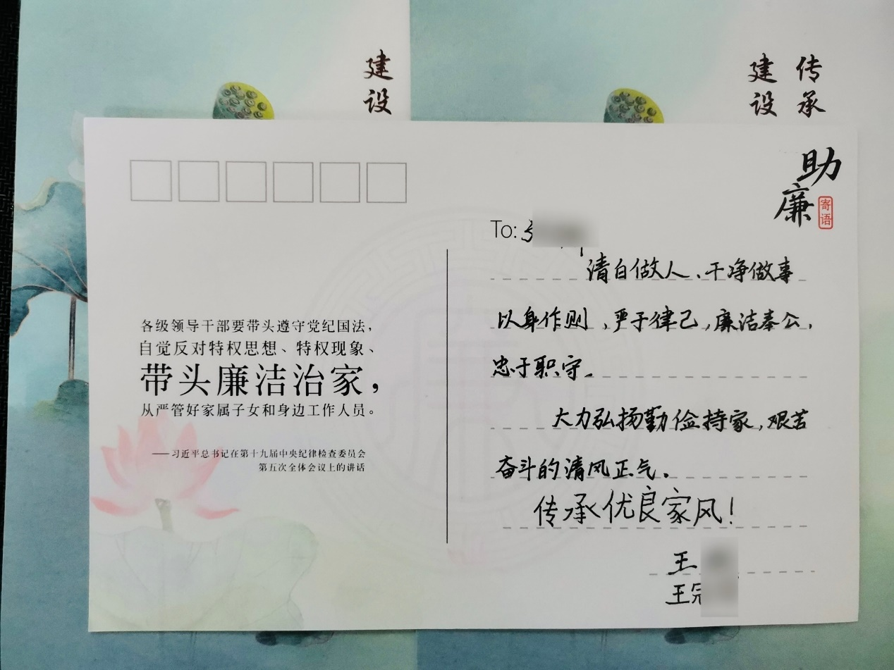 省藥科院紀委向黨員干部家屬寄出《致省藥科院黨員干部家屬的一封信》,并征集“家庭助廉·親情寄語”。一張張卡片闡述著清廉、敬業(yè)、節(jié)儉、孝順的家風家訓,傳遞著家屬對黨員干部們的關愛與提醒,進一步推進了監(jiān)督預防關口前移。
